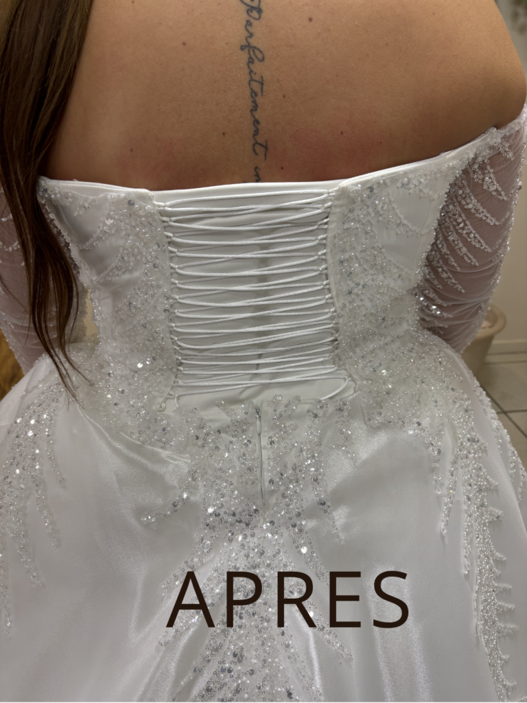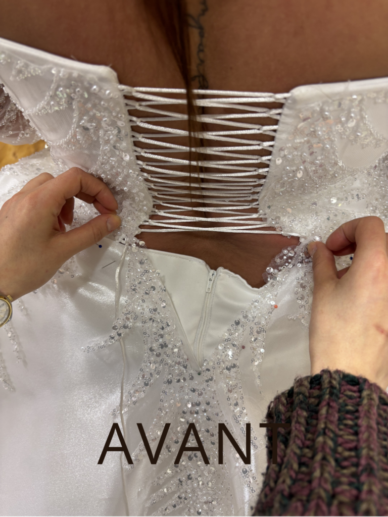 Chaque retouche est réalisée avec précision pour que votre robe épouse parfaitement votre silhouette, tout en respectant son style, ses matières et ses détails.